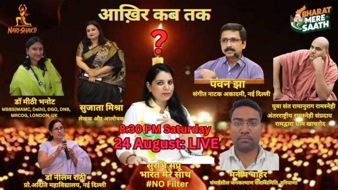 नमस्कार भारत मेरे साथ चैनल की सीरीज़ LIVE // No filter में आप सभी दर्शकों का स्वागत है। आज इस सीरीज़ में बात करेंगी भारत मेरे साथ चैनल से सुरभि सप्रू और तर्क वितर्क करेंगी डॉ नीलम राठी, डॉ मीठी भनोट, डॉ सुजाता मिश्रा, पवन झा, मनीष चाहर , युवा संत रमानुराग रामस्नेही । इस तर्क वितर्क में जो मुद्दा है वो है कलकत्ता का डॉक्टर वाले केस में जो कोलकाता की एक होनहार ट्रेनी डॉक्टर की आरजी मेडिकल कॉलेज में रेप के बाद हत्या कर दी जाती है। एक दर्जी पिता की वह इकलौती बेटी थी। मां और पिता का रो-रोककर बुरा हाल है। जिंदगीभर संघर्ष करके बेटी की पढ़ाया। अब वह उनका बुढ़ापे में सहारा बनने वाली थी लेकिन सबकुछ तबाह हो गया।
