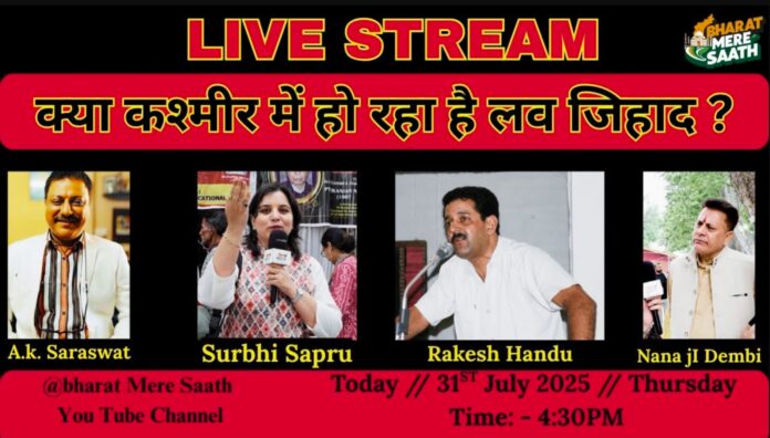 इस सीरीज़ में आज डिबेट करेंगे कश्मीर से नाना जी डेम्बी, रोहित रैना, राकेश हांडू, मुंबई से अजय कॉल सारस्वत, दिल्ली से दीपक जी लव ज़िहाद के विषय में बातचीत करेंगे।