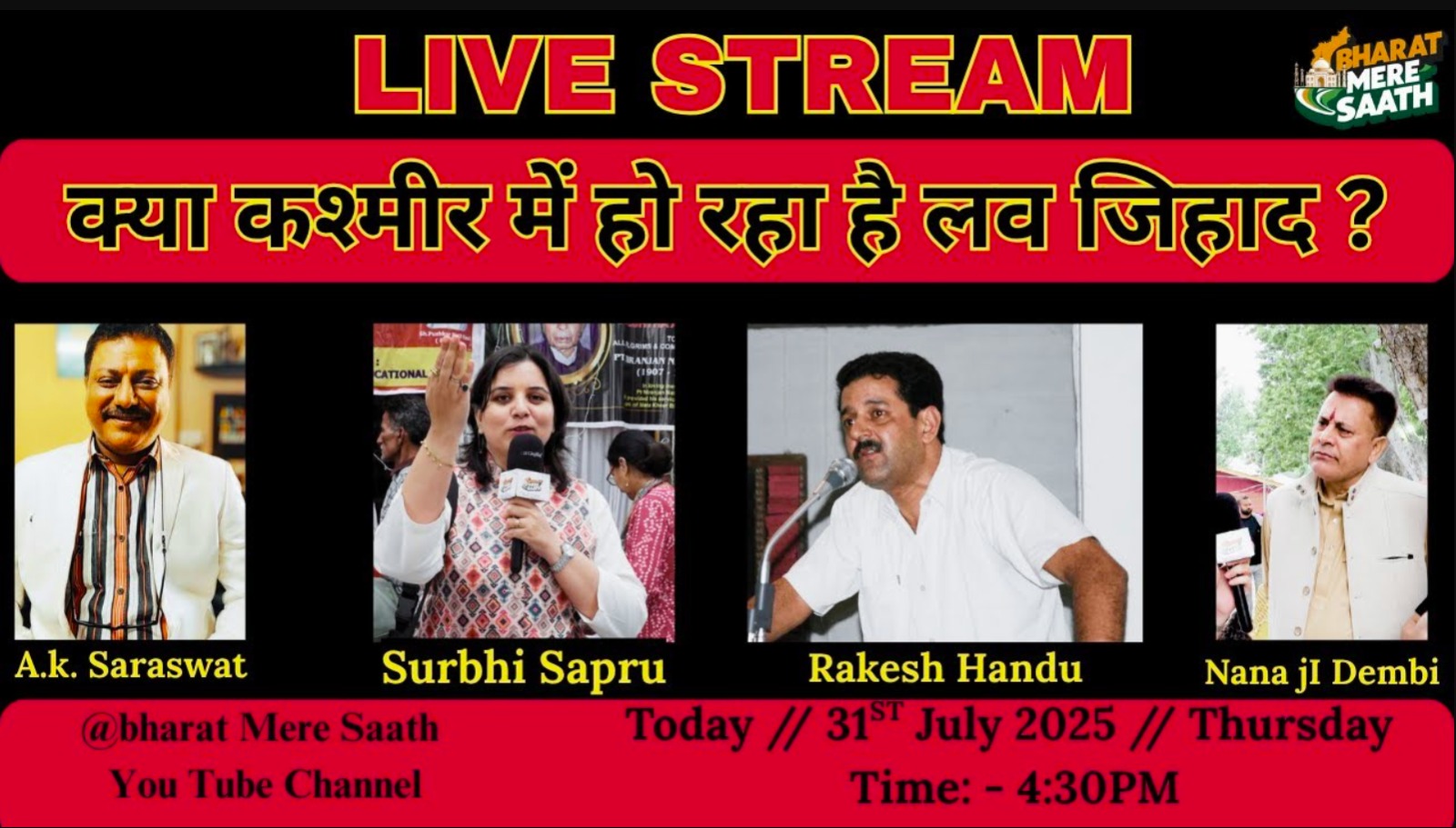 शीर्षक:- नमस्कार भारत मेरे साथ चैनल की सीरीज़ No filter Live Debate में आप सभी दर्शकों का स्वागत है। आज का बहुत ही महत्वपूर्ण विषय है। जो कश्मीर में धर्म परिवर्तन और लव ज़िहाद पर आधारित है। इसका संचालन करेंगी भारत मेरे साथ चैनल से सुरभि सप्रू जी
