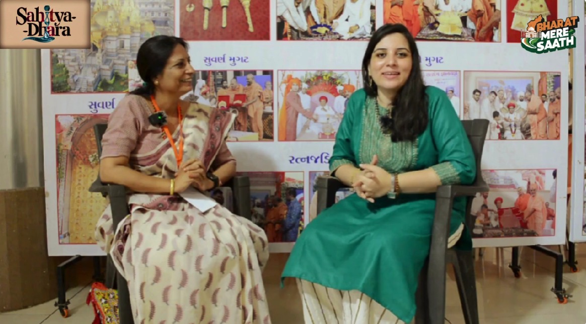शीर्षक:- नमस्कार भारत मेरे साथ चैनल की सीरीज़ साहित्य धारा में आप सभी दर्शकों स्वागतः है। साहित्य धारा सीरीज़ में भारत मेरे साथ चैनल हिंदी साहित्य, भाषा, बोली, संस्कृत, शब्द, लेखनी इत्यादि विषय पर बात की जाती है। भारत मेरे साथ चैनल से सुरभि सप्रू स्वामी नारायण मन्दिर वड़ताल गुजरात में महिला साहित्यकार सम्मेलन में भाग लेने के लिए आयी हैं। और महिला साहित्यकार सम्मेलन में आयी हुयी कवित्रियोँ से स्त्री विमर्श और स्त्री चिंतन और साहित्य के विषय पर चर्चा करेंगी। महिला साहित्यकार सम्मेलन में बीकानेर से आयी हुयी आशा शर्मा जी बात करेंगी।