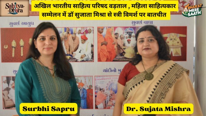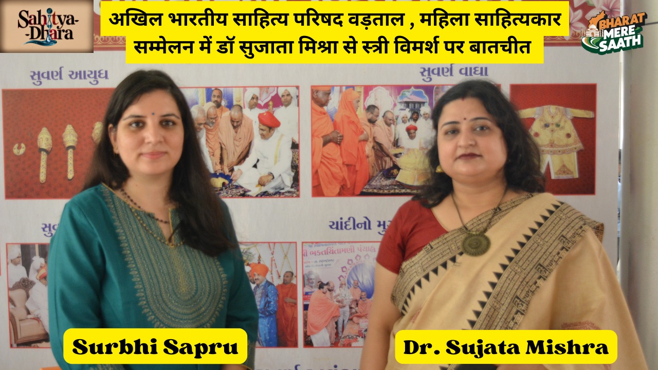 शीर्षक:- नमस्कार भारत मेरे साथ चैनल की सीरीज़ साहित्य धारा में आप सभी दर्शकों स्वागतः है। साहित्य धारा सीरीज़ में भारत मेरे साथ चैनल हिंदी साहित्य, भाषा, बोली, संस्कृत, शब्द, लेखनी इत्यादि विषय पर बात की जाती है। भारत मेरे साथ चैनल से सुरभि सप्रू स्वामी नारायण मन्दिर वड़ताल गुजरात में महिला साहित्यकार सम्मेलन में भाग लेने के लिए आयी हैं। और महिला साहित्यकार सम्मेलन में कई राज्य और प्रदेश से आयी हुयी कवित्रियोँ से स्त्री विमर्श और स्त्री चिंतन और साहित्य के विषय पर चर्चा करेंगी। इस वक्त महिला साहित्यकार सम्मेलन में आयी हुयी डॉ सुजाता मिश्रा जो सागर मध्य प्रदेश से हैं। आज इनसे बात होगी स्त्री की अस्मिता पर और युवाओं की जो समस्या है जो युवाओं को हमेशा से गलत ठहराया जाता है। कि वो शादी नहीं कर रहे है वो बच्चे नहीं कर रहे हैं और अपने माता पिता की सेवा नहीं कर रहे हैं?