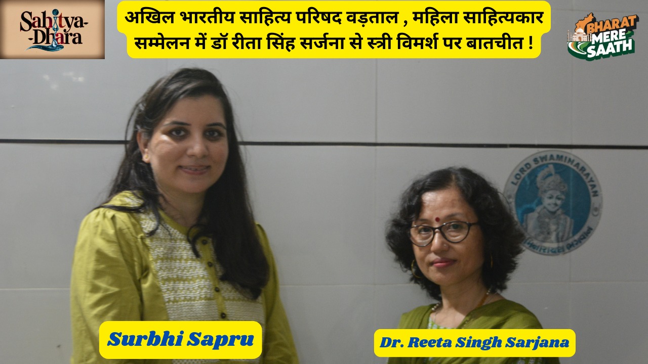 शीर्षक:- नमस्कार भारत मेरे साथ चैनल की सीरीज़ साहित्य धारा में आप सभी दर्शकों स्वागतः है। साहित्य धारा सीरीज़ में भारत मेरे साथ चैनल हिंदी साहित्य, भाषा, बोली, संस्कृत, शब्द, लेखनी इत्यादि विषय पर बात की जाती है। भारत मेरे साथ चैनल से सुरभि सप्रू स्वामी नारायण मन्दिर वड़ताल गुजरात में महिला साहित्यकार सम्मेलन में भाग लेने के लिए आयी हैं। और महिला साहित्यकार सम्मेलन में कई राज्य और प्रदेश से आयी हुयी कवित्रियोँ से स्त्री विमर्श और स्त्री चिंतन और साहित्य के विषय पर चर्चा करेंगी। इस वक्त महिला साहित्यकार सम्मेलन में आयी हुयी डॉ रीता सिंह सर्जना जो असम से हैं। और इनकी लिखने की विद्या है कहानियां लघु, कथाएँ, कविताएँ और शोध पत्र ये प्रस्तुत भी करती हैं।